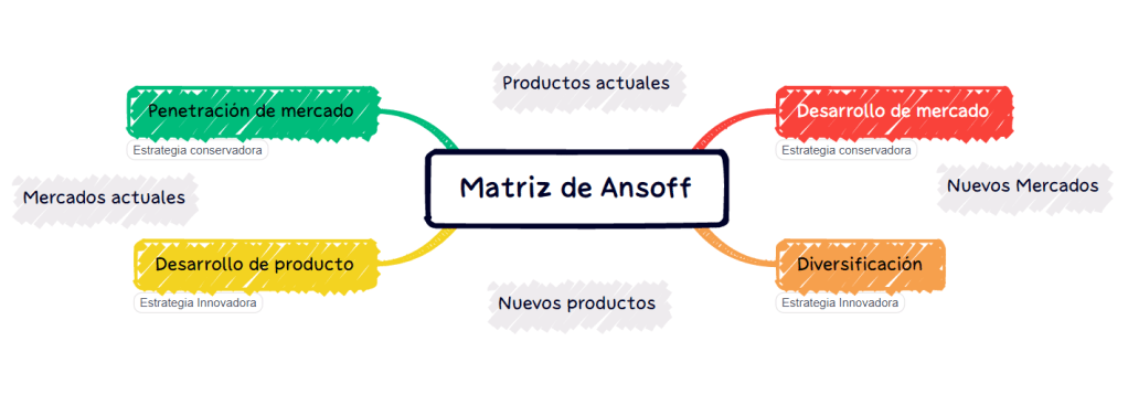 La matriz de Ansoff es una herramienta utilizada para la definición de estrategias de crecimiento. Las cuatro propuestas se presentan por 4 cuadrantes dónde se cruzan los ejes de mercado y producto.