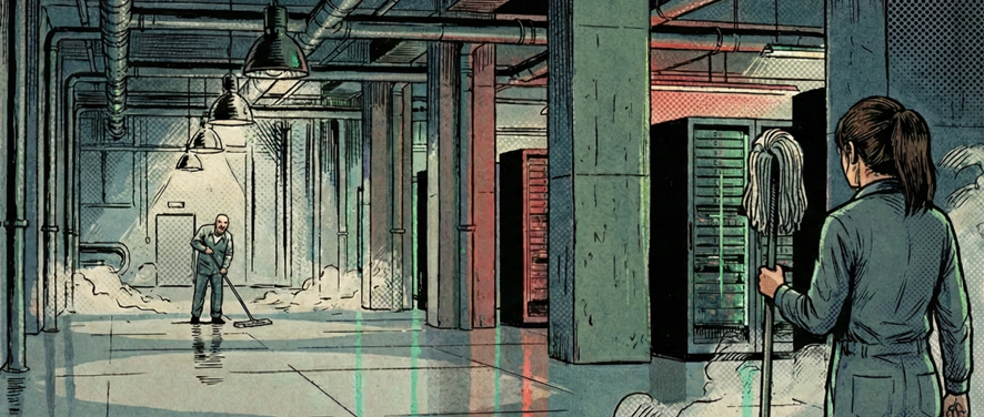 Ramón pasaba la mopa con movimientos largos y económicos. No era un autómata, era un profesional, disfrutaba haciendo las cosas bien. Miraba las luces verdes parpadear en los racks negros con una mezcla de respeto y familiaridad.